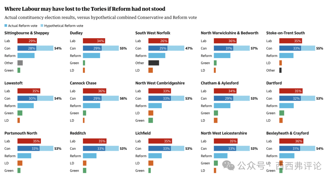 雖然極右的改革黨獲得了14.3%的選票,但只拿到了0.8%的席位(5個)。因為改革黨雖然分散了保守黨的選票,但結果是工黨漁翁得利,改革黨的選票數量不足以在小選區中排名第一。改革黨只得到了5個議席,但是在另外 103 個選區中位居第二。其中 12 個選區,改革黨與獲勝的差距在 5,000 票以內。