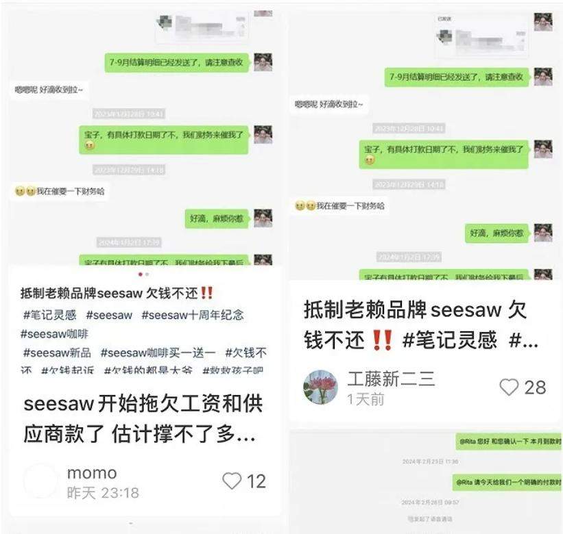 此外,供應商也成為價格戰的受害者——今年3月,社交平台出現多篇圖文,有網友稱自己是精品咖啡Seesaw的供應商,被品牌方拖欠7-9個月的貨款,雙方雖然協議分期付款,但從後續情況來看,Seesaw的履約情況並不到位。