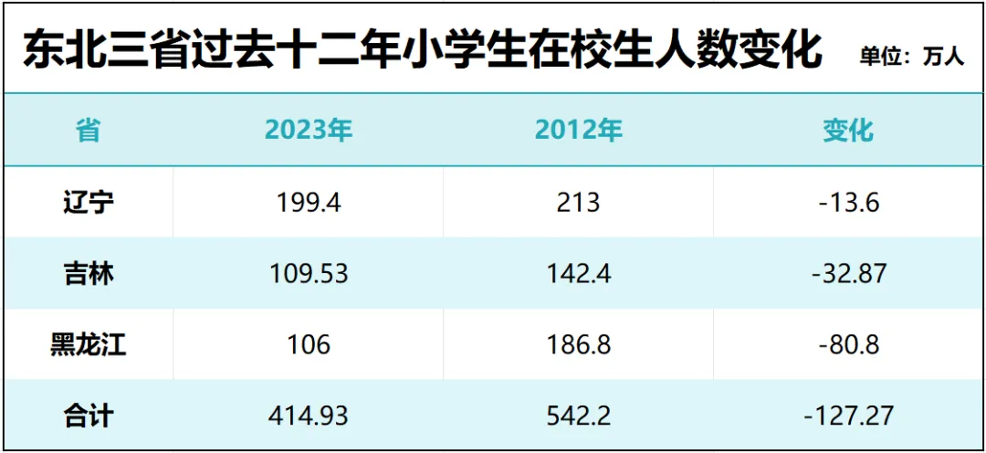 以人口減少規模最大的黑龍江省來看,該省小學在校生人口2012年有186.8萬,,2023年跌至106萬人,十二年減少了80.8萬