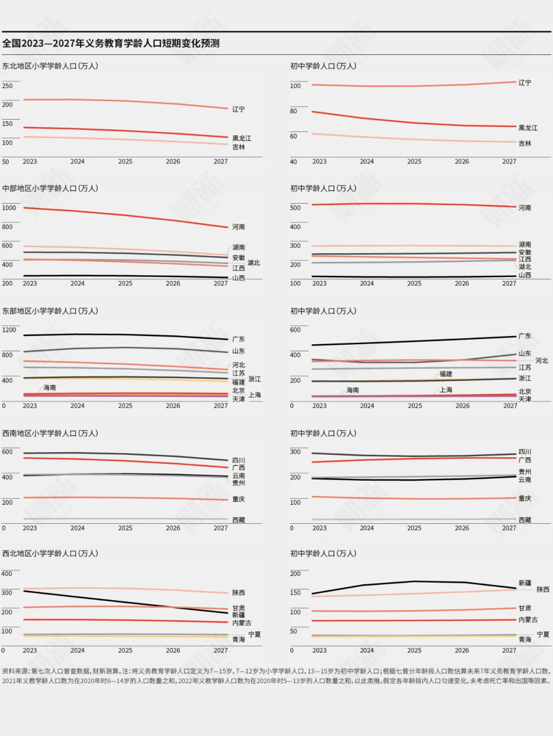 2023-2027年,江西小學在校生預計減少60餘萬人,下降近兩成;湖南小學在校生預計減少80餘萬人,降超六分之一。
