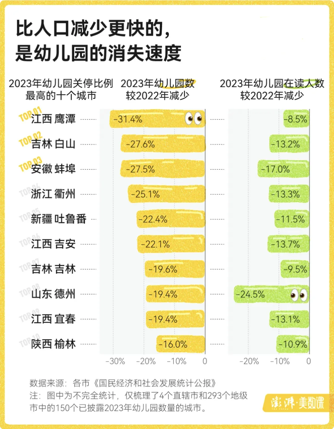 例如2022年時,江西鷹潭市在園幼兒為3.34萬人,相較2021年減少8.8%,幼兒園數量從2021年的441所略降到了421所,但2023年幼兒園數量驟降到了289所,一年減少了31.4%。這一年在園人數相較上一年同樣還是減少了8.5%,有3.06 萬人。