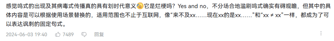 在這個移動遊戲也在為了引流爭破了腦袋的時代,《絕區零》做到了“遊戲未到,梗先行”,相比於正經的遊玩體驗與宣傳,“樂子人”的抽象擠佔了社媒評論區的前排。這一點在此前《鳴潮》發佈時也有絕佳的案例展現。“XX是這樣的,XX只要XX就可以了,而XX需要考慮的事情就很多了。”這是來自《鳴潮》劇情中的一句話,由於邏輯逆天,且泛用性極強,被網友引用到各種類型視頻的評論區,成為了比《鳴潮》遊戲本身還火的“鳴潮公式”。
