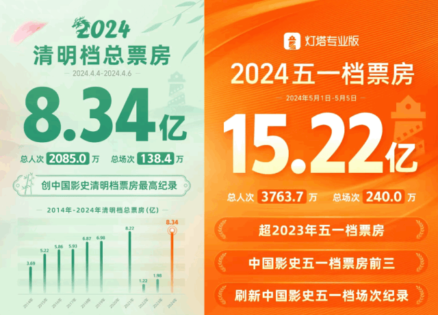 非檔期黑馬《周處除三害》(圖源:燈塔專業版)然而形成強烈反差的是,今年的清明節檔以8.34億的成績刷新了中國影史清明節檔票房最高紀錄,五一檔日均大盤3.05億,位居檔期影史第四,放映場次刷新檔期影史紀錄。在這種情況下,各個檔期仍未讓電影票房保證上揚勢頭,可見大盤冷熱不均情況之嚴重。