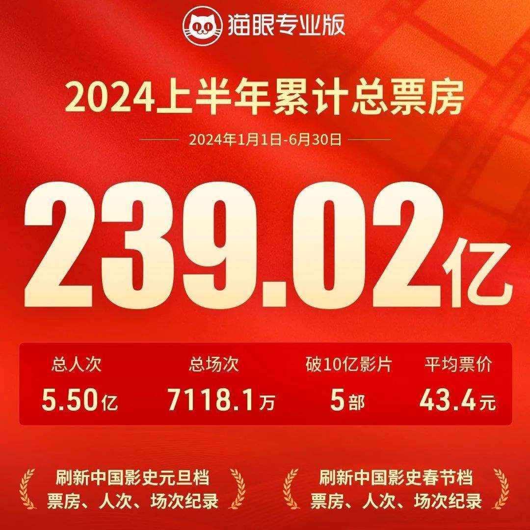 編輯|劉南豆2024年上半年電影市場在尤其萎靡的6月大盤中落下帷幕。據貓眼專業版顯示,上半年總票房239.02億,同比減少23.28億;平均票價43.4元,同比去年差距不大;總人次5.5億,同比去年減少5300萬人次;總場次7118.1萬,同比去年增長843.2萬。也就是説,在票價不變、場次增長、人次降低的情況下,總體票房下降了8.8%,觀影人次的流失是主要原因。