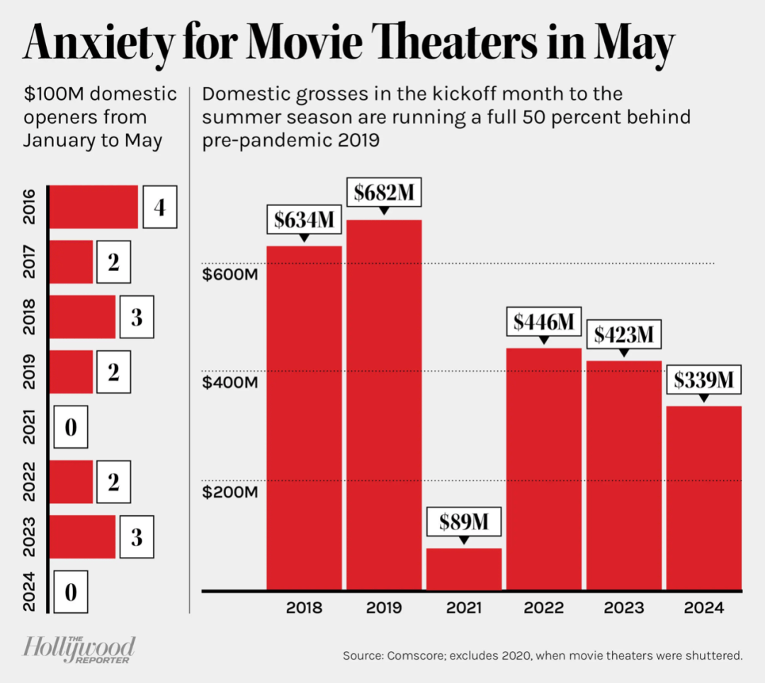 一般來説,5月是好萊塢的暑期檔“前哨戰”,但一如國內的6月票房一樣,整個市場大盤最是慘淡。5月1日至19日期間,北美票房收入較去年下降近20%,比 2019年下降50%。“我們知道情況會很糟糕,但沒想到會這麼糟糕,”一位頂級電影公司高管接受《好萊塢報道》時説道。