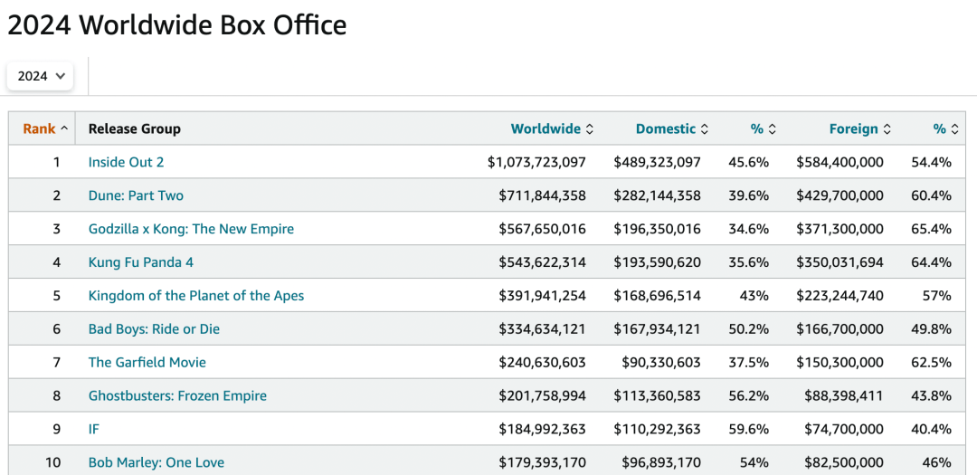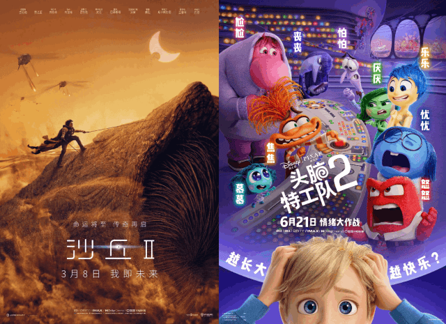 在國產片無力提供更多內容供給的情況下,引進片也未能支撐起大盤希望。今年上半年,引進片依舊佔據着電影大盤中不高的比重。根據燈塔數據顯示,引進片佔比15.3%,同比去年升高1.8%,遠不及疫情前。疫情之後,觀眾對於引進片的興趣持續性滑落,尤其是以前撐起票房大盤的好萊塢大片,已經許久沒有出現超10億的電影了。對比海內外的市場表現,這種差距格外明顯。《沙丘2》《頭腦特工隊2》是目前全球票房第一二位,作為全球十大票倉之一的中國,貢獻佔比卻並不算多,《沙丘2》的全球票房中,中國以4904萬美元的成績位列第三,《頭腦特工隊2》更甚,中國以2900萬美元的成績位列全球第七,不及巴西、意大利。