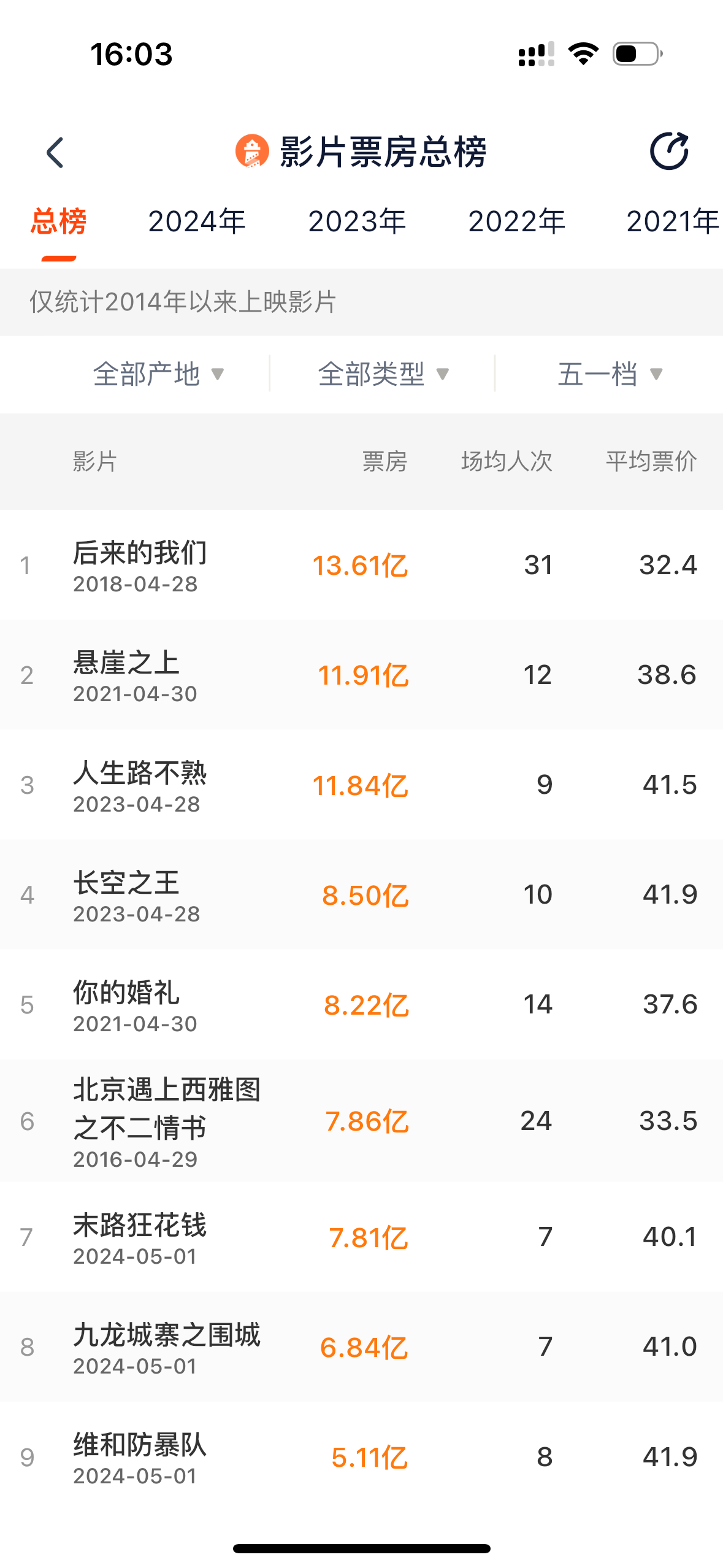 五一檔票房排名(圖源:燈塔專業版)寧願“賭”一把熱門檔期,也不願“賭”一把週末檔,可見,片方仍缺少對週末檔的信心,在已知的、可驗證的市場環境裏生存,才是最安全的。週末檔被擱置的檔期潛力無法為電影大盤持續蓄熱,觀眾的觀影期待在忽冷忽熱間逐漸趨於過度理性的狀態。一味迷信檔期紅利的負面效果很快顯現,今年的端午節檔直接以“近十年最差端午檔”的成績觸礁,業內篤信的檔期規律在端午節驟然失效。可以説,合理的定檔策略是非常有必要的,提供長久持續的內容供應才能保證每一部電影有合適的發展空間。與其迷信檔期紅利,不如篤定內容價值。