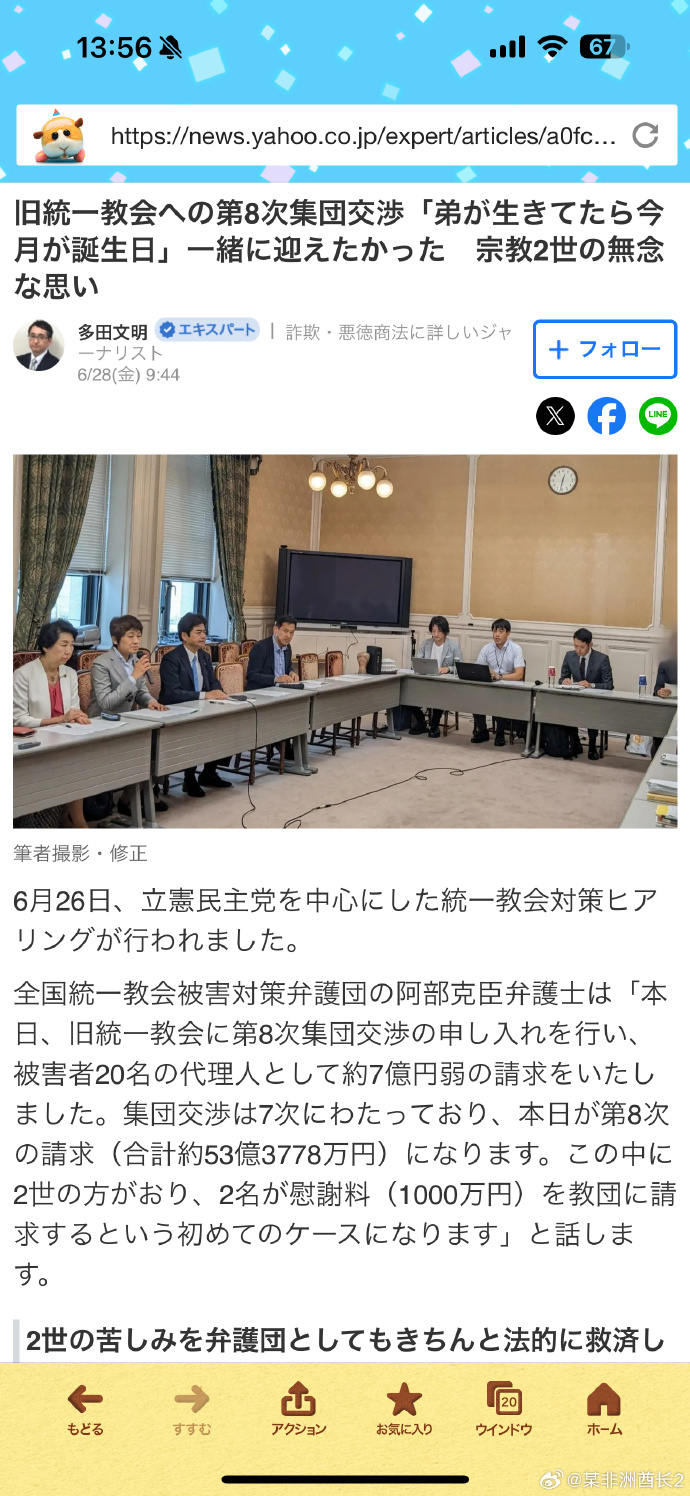 🔹除了官司,為統一教會被害者奔走的律師團體也和統一教會進行了第八次集體協商,總計要求統一教會賠償所有被害人合計56億多日元,這個談判估計在解散命令出來前不會有結果的(圖六)