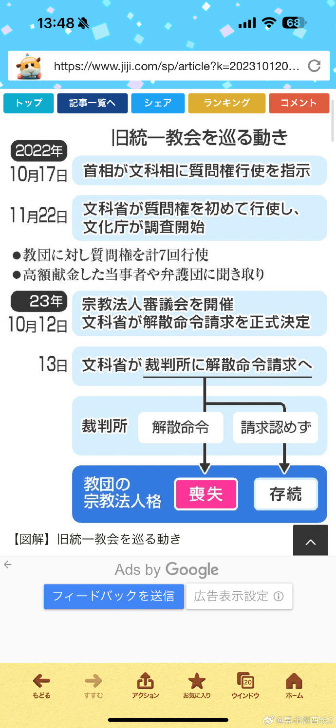 🔹目前統一教會手頭還有幾個大官司,一個之前因為統一教會在文部科學省的詢問會(當聽證會理解)上對眾多問題沒有做出解釋,文部科學省向統一教會處以10萬日元的行政罰款(對你沒看錯才10萬日),就這10萬日的罰款統一教會還不同意交去打官司,然後今年3月判決出來了判統一教會必須交這罰款。