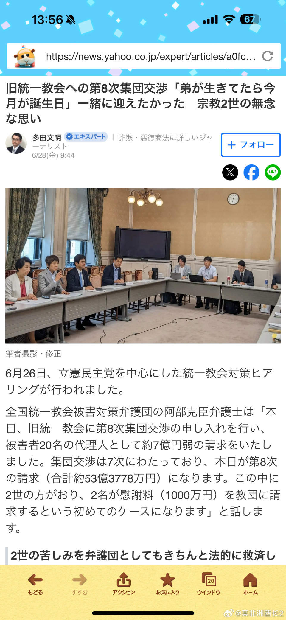 🔹除了官司,為統一教會被害者奔走的律師團體也和統一教會進行了第八次集體協商,總計要求統一教會賠償所有被害人合計56億多日元,這個談判估計在解散命令出來前不會有結果的