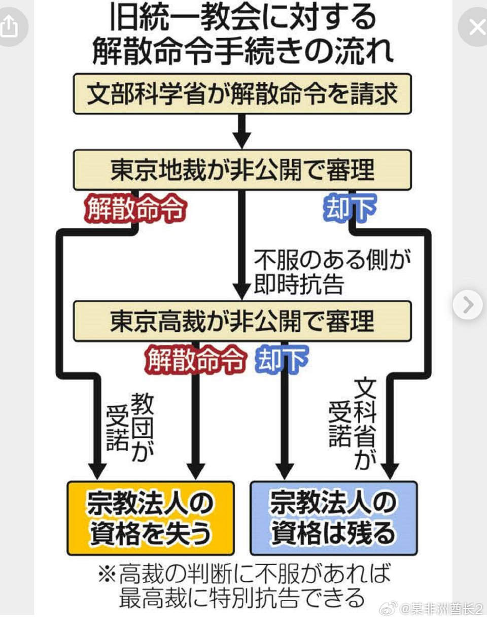 🔹2022年安倍遇刺後統一教會的問題開始浮上台面,2022年11月開始日本文部科學省對舊統一教會進行了7次詢問會,2023年10月文部科學省決定向法院申請解散統一教會,但這個解散申請必須要法院認可才能生效(圖三),為啥這麼麻煩因為這事現在美名其曰還屬於日本民法的管轄範圍內,同時日本的法律規定了宗教自由不能上來就上強硬手段[二哈]