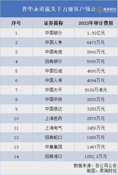 2023年,普華永道最高審計費用是中國銀行的1.93億元,14家客户審計費用亦達千萬元級別,這些客户均已公告與其取消合作。