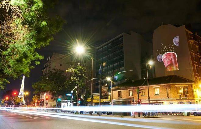 **除了用「HEYTEA」「New Asian Tea」「喜茶」等字樣來點明IP,喜茶還將自己的王牌產品「多肉葡萄」投射到了埃菲爾鐵塔旁邊的部分建築上,**看到自己的「白月光」,許多法區留子也表示要坐不住了。
