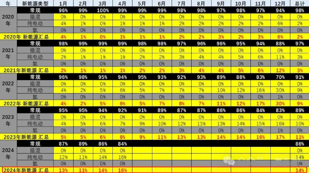 據乘聯會秘書長崔東樹統計,今年前4個月,我國新能源商用車的滲透率為14%,其中4月份單月的滲透率為16%。如果和2023年新能源滲透率的11%、2022年的9%相比,其增長勢頭向好。但如果和同期的新能源乘用車相比,則至少落後30個百分點。