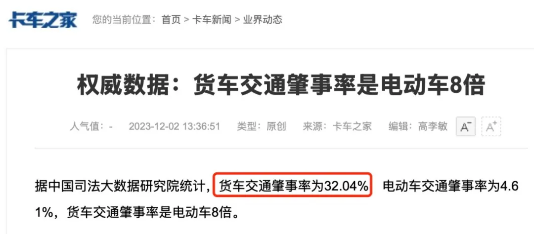商用車,尤其是重型貨車,交通事故率通常高於普通乘用車。根據交管部門統計數據,**貨車交通肇事率達到了32.04%,儘管貨車僅佔全部機動車保有量的10%,但導致的一次死亡3人以上的事故卻佔到了30%以上。**其中涉及重型貨車的交通事故死亡率達到了58%。