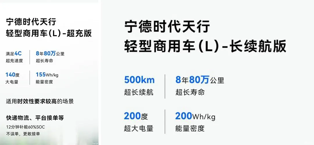 寧德時代“天行”商用車電池經過十幾年的自我完善,一連推出了兩款輕型商用車動力電池產品,天行L—超充版和長續航版。