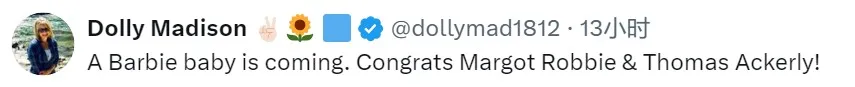 “芭比的孩子要出生了,恭喜瑪格特·羅比和湯姆·阿克雷!”