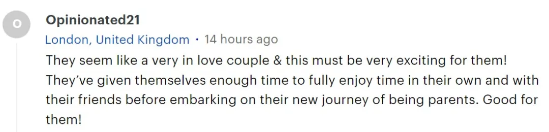 “他們看起來十分恩愛,一定對懷孕感到非常興奮!在開啓為人父母的新旅程之前,他們給自己留了足夠的時間,充分享受與自己和朋友共處的時光。為他們感到高興!”