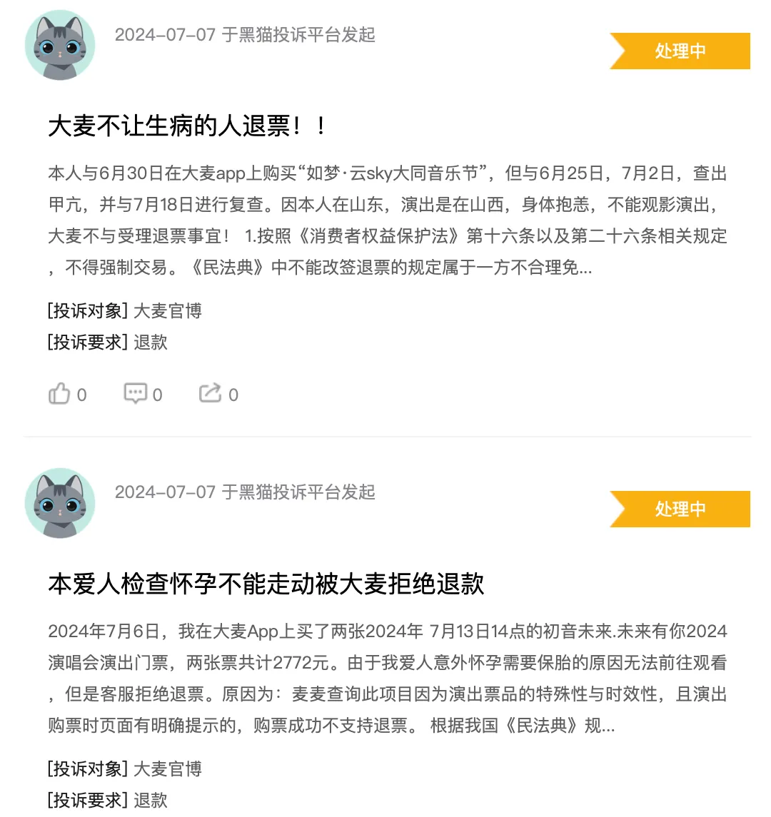 鹽財經記者梳理發現,截至7月7日,在黑貓投訴平台上,消費者針對大麥的累計投訴達49348條,近30天的投訴量就達2196條,投訴內容多指向“退票手續費高”“退票退款難”“強制消費、拒絕退票”等問題。