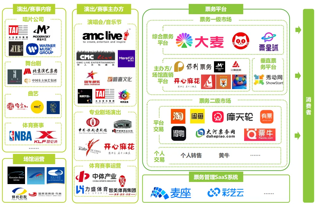 票務一級市場,包括大麥為代表第三方票務平台以及主辦方直銷平台,負責售票、出票和檢票。