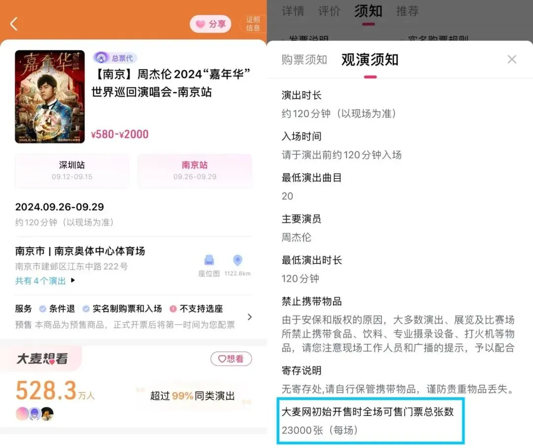 以2024年9月周杰倫演唱會南京站為例,大麥網顯示初始開售時全場可售門票總張數為23000張(每場)/圖源:大麥App截圖
