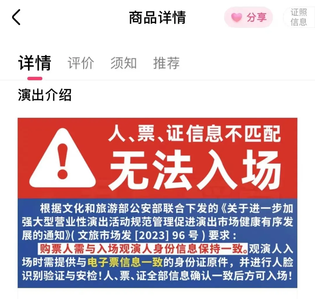 為打擊黃牛,規範票務市場,去年9月,文化和旅遊部、公安部聯合發佈通知,要求大型演出活動實行實名購票和實名入場制度,每場演出每個身份證件只能購買一張門票,購票人與入場人身份信息保持一致,實行“人、票、證”三者統一的強實名制。