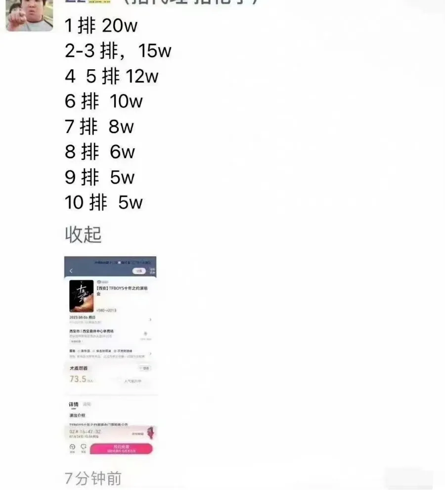 在粉絲中流傳的TFBOYS十週年演唱會前排票黃牛價格圖/圖源:網絡