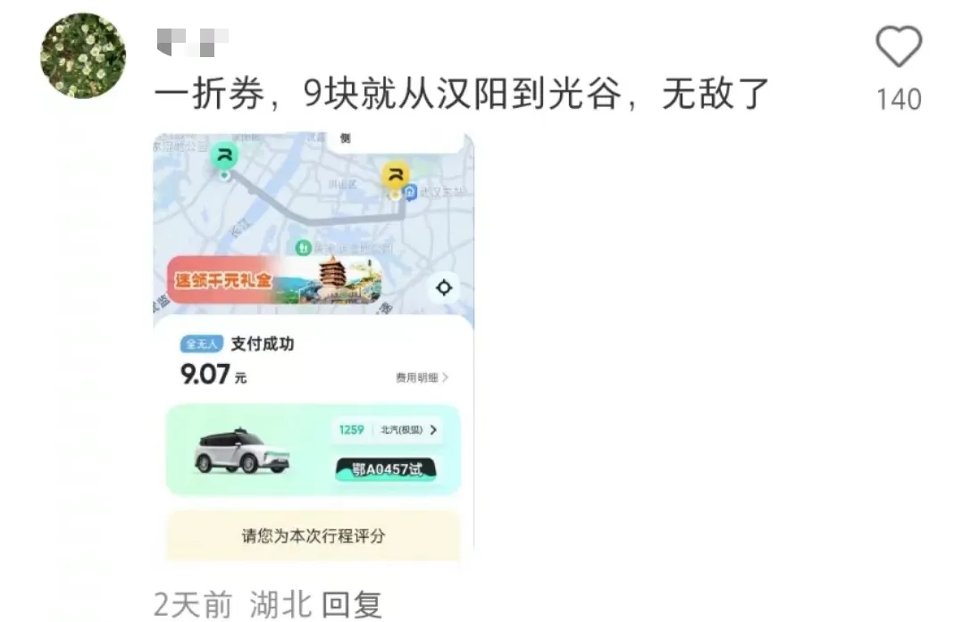 有網友分享,自己從漢陽到光谷,只花了9元,而正常打車需要50元以上。