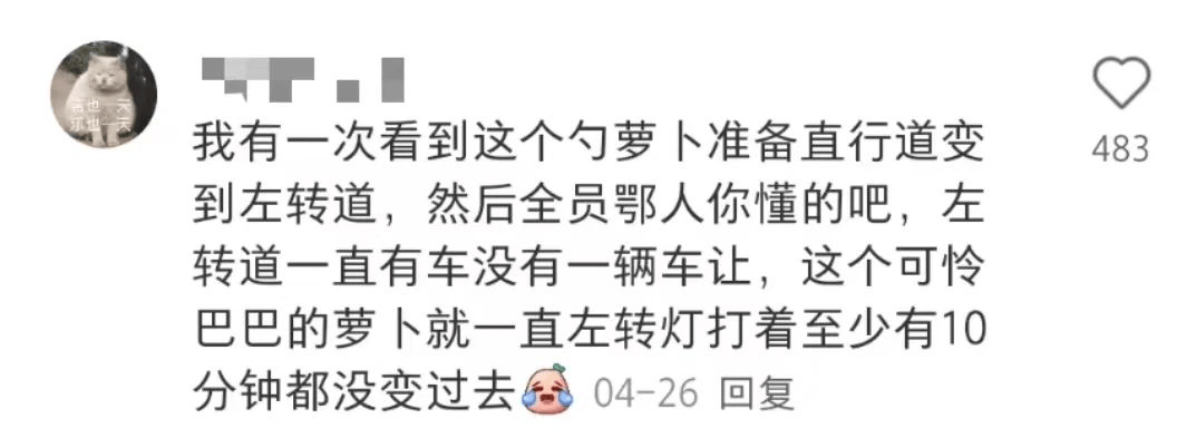 一位網友分享稱,自己看到蘿蔔快跑打着轉向燈,10分鐘都沒轉過去。