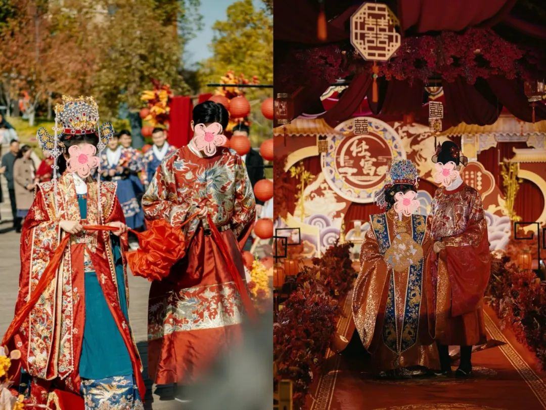 你看張燈結綵的中式婚禮,鳳冠霞帔替代了婚紗禮服。