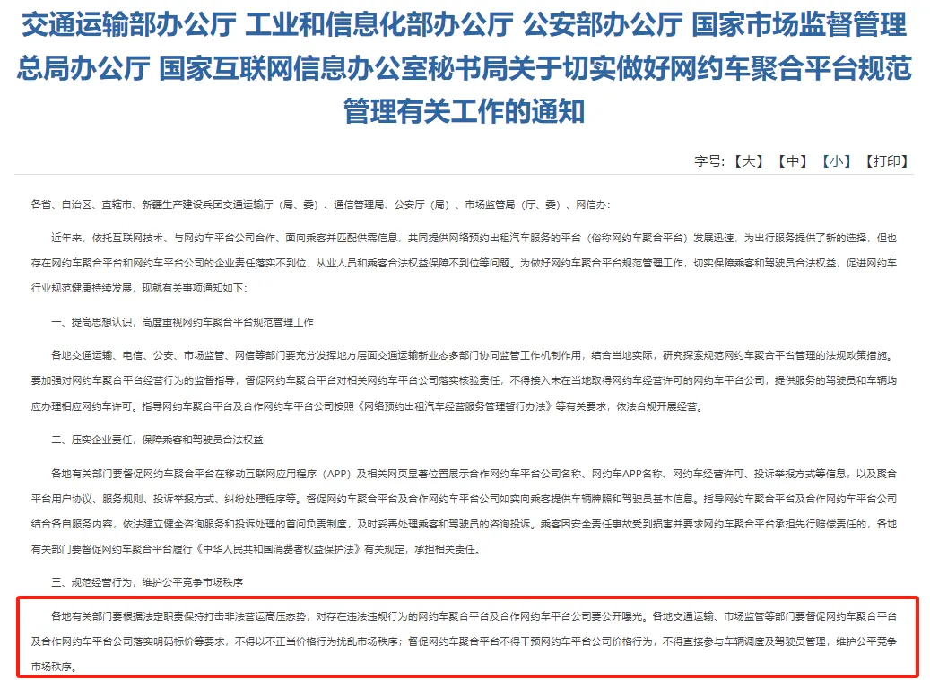 2023年4月,交通運輸部等五個部門發佈的《關於切實做好網約車聚合平台規範管理有關工作的通知》明確指出網約車聚合平台不得干預網約車平台公司價格行為,不得直接參與車輛調度及駕駛員管理,維護公平競爭市場秩序。