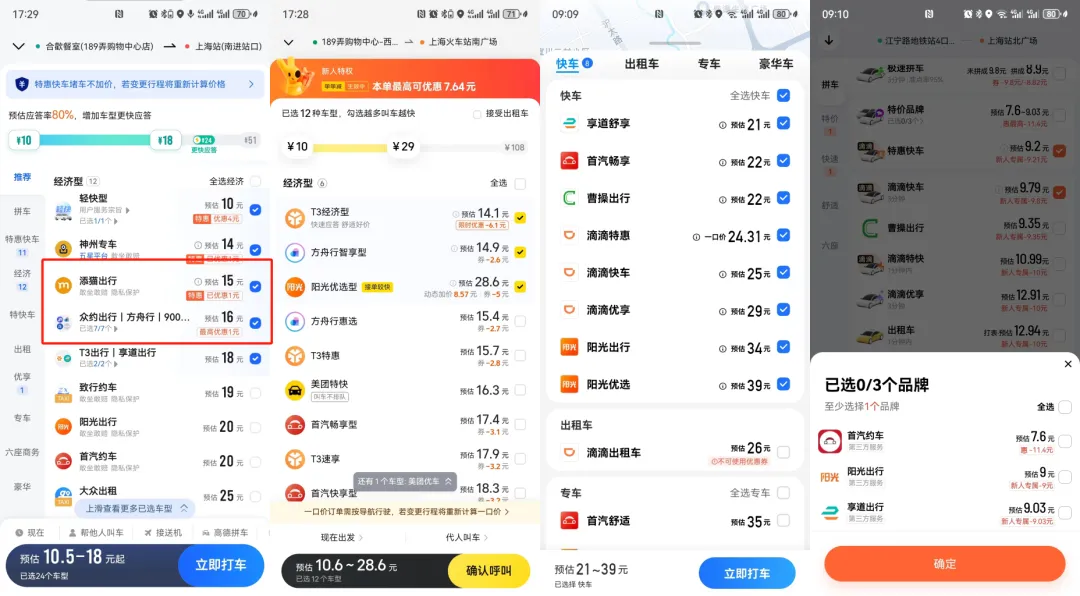 在上海,花小豬出行、百度打車、騰訊出行、美團打車四家聚合平台中,出行人可選擇的平台包括曹操出行、首汽出行、享道出行、陽光出行、T3出行等知名的網約車平台,並沒有其他小平台,但在高德地圖打車時,添貓出行、62580約車、900出行、方舟行、眾約出行等中小平台出現頻次更高。