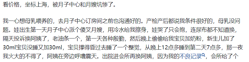 有一位母親在知乎吐槽,説自己在入住月子中心後,被不專業的月嫂氣到情緒崩潰,結果月子中心非但沒及時道歉,後續更換的月嫂更是槽點滿滿。