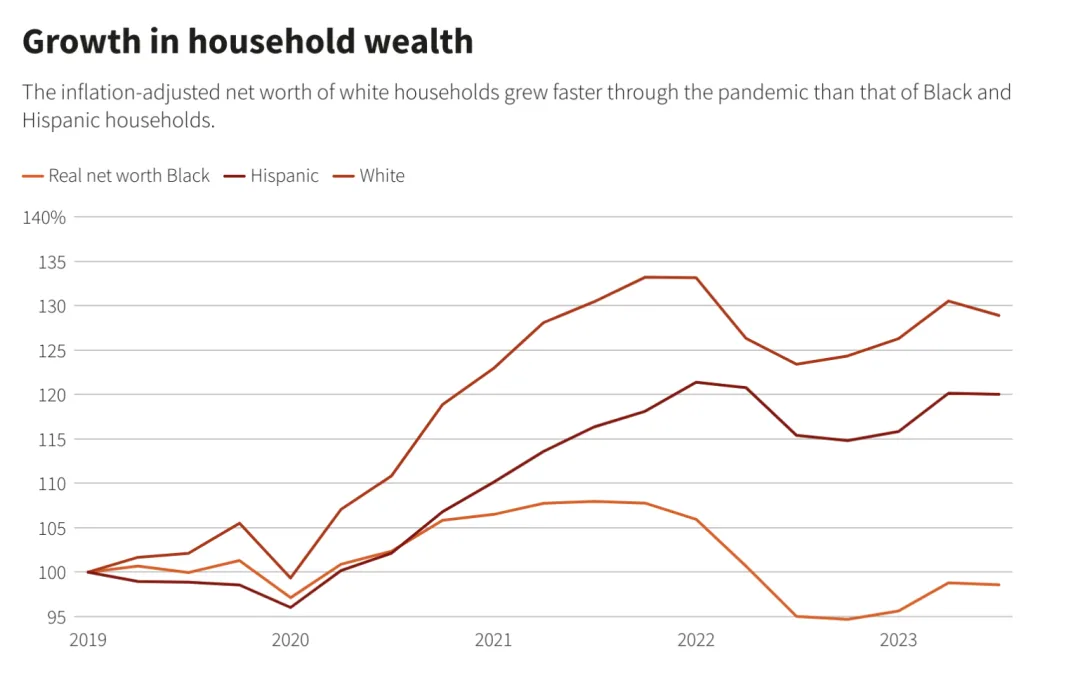 2023年9月,紐約聯儲研究顯示,白人家庭經濟通脹調整後的淨資產增長速度快於非裔和西班牙裔家庭,美國財富不平等在當前經濟復甦中進一步加劇(圖源:紐約聯邦儲備銀行)