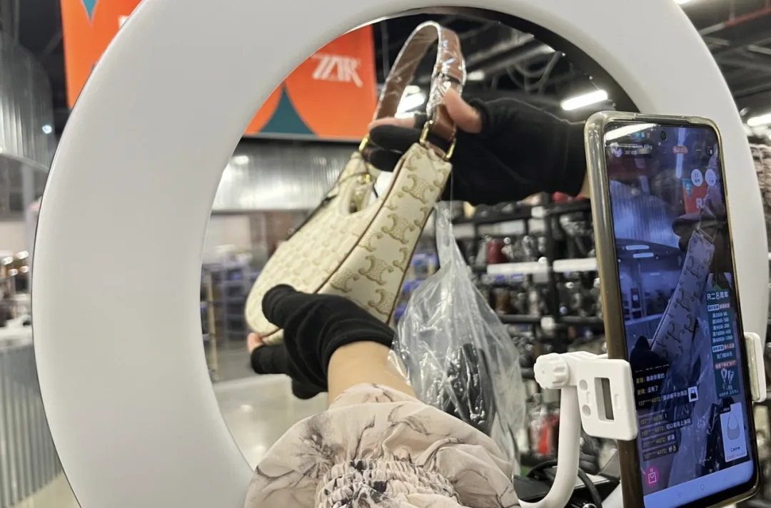 2023年7月5日,中國上海二手奢侈品電子商務平台 ZZER 的倉庫裏,一名主播在直播中推銷一款包(圖源:路透社)