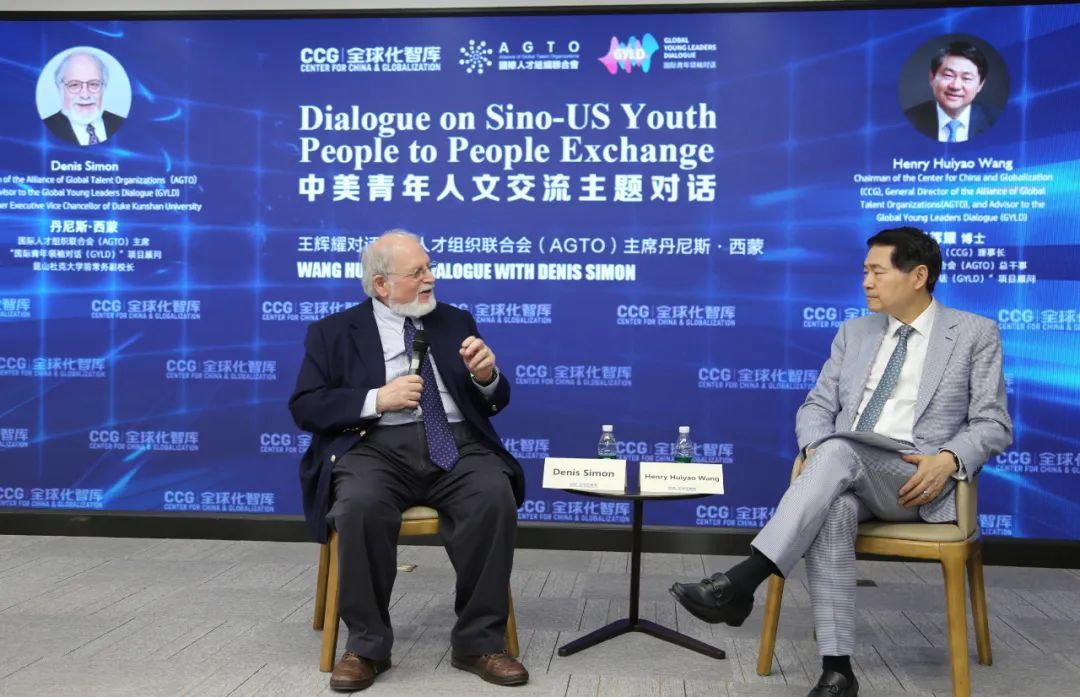 之後,丹尼斯·西蒙還與CCG理事長王輝耀博士圍繞如何增進中美青年人文交流進行了深入對話。王輝耀理事長博士提出,世界需要更多的中國通,更多瞭解中國的人能夠幫助呈現一個全面完整的中國面貌。中國有幾千所高校、上千所國際學校,中美之間有200多對友好城市,中美民間仍然有着很強的聯繫,這些平台、資源、網絡都可以發揮作用,化整為零,促進中美青年開展交流。丹尼斯·西蒙表示,中國吸引美國青年來華交流,除了強調在硬件、便利服務等方面的優勢,還要考慮美國青年來華交流學習能夠對他們的職業生涯有什麼幫助。