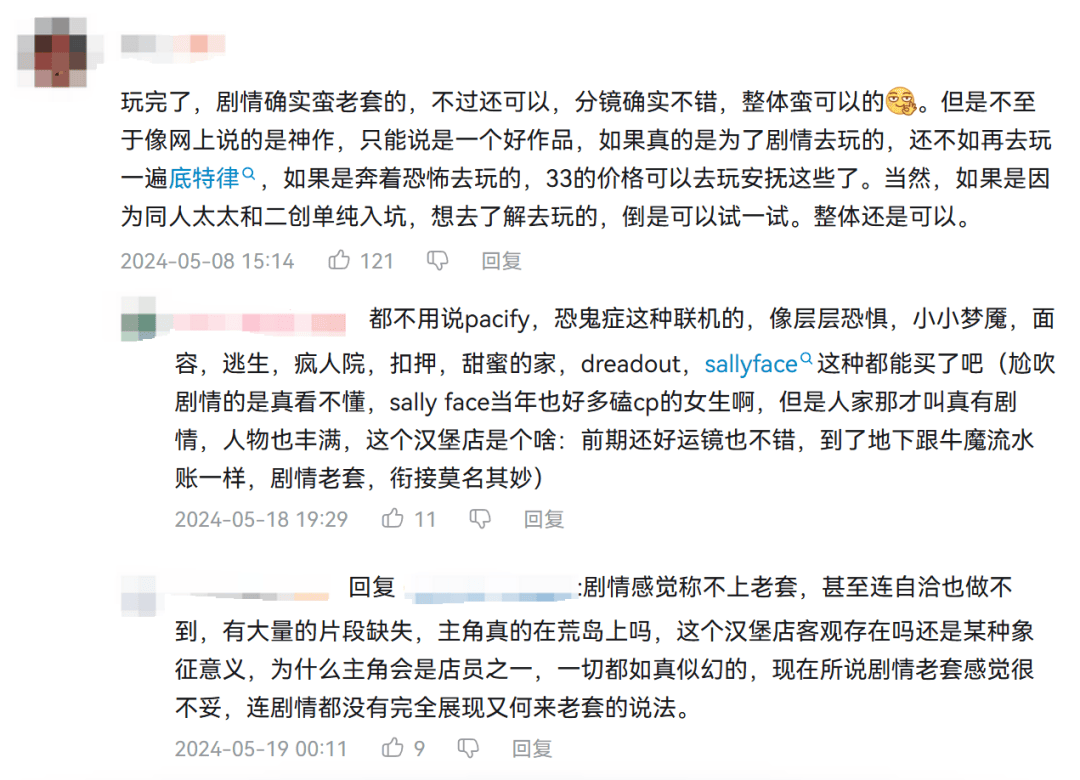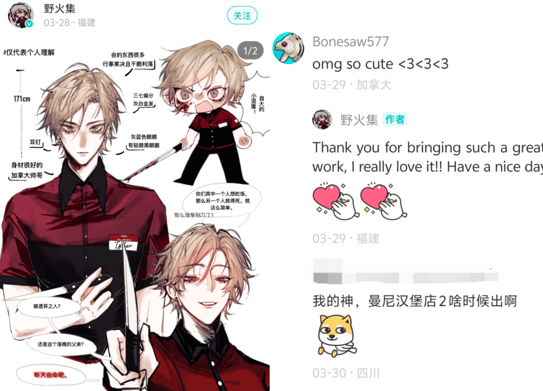 面對國內驚人的熱度,Bonesaw投入了大量精力回應。平時他基本處於高強度自搜的狀態。各類遊戲視頻或二創的評論區,大概率都能看到他的身影,或許正是靠着這種雙向奔赴的同人氛圍,《曼尼漢堡店》的二創熱度保持着穩定增長,在同人圈 “騙”到了越來越多的關注。