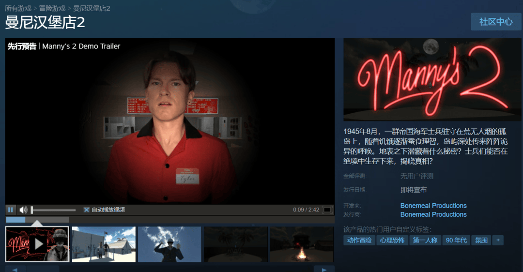 Bonesaw就正面對着這樣的問題:畢竟早在3月的時候,Bonesaw就預告《曼尼漢堡店2》已經在路上了。到了6月30日,Bonesaw免費放出了《曼尼漢堡店2》的試玩Demo,二代的氛圍比前作更加黑暗,展露出一種擴展世界觀的野心,各種試玩視頻都獲得了不錯的播放量。