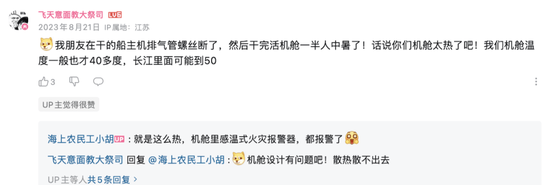 機艙內幾十噸的機器噪音轟鳴,機艙温度又常年高達攝氏30~40度。