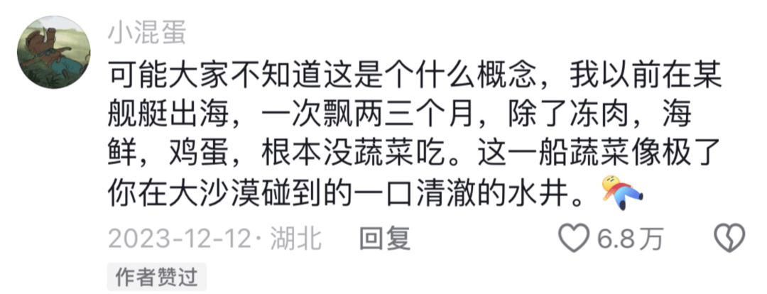 這得解釋解釋,沒當過海員,不知道新鮮蔬果對海員有多珍貴。