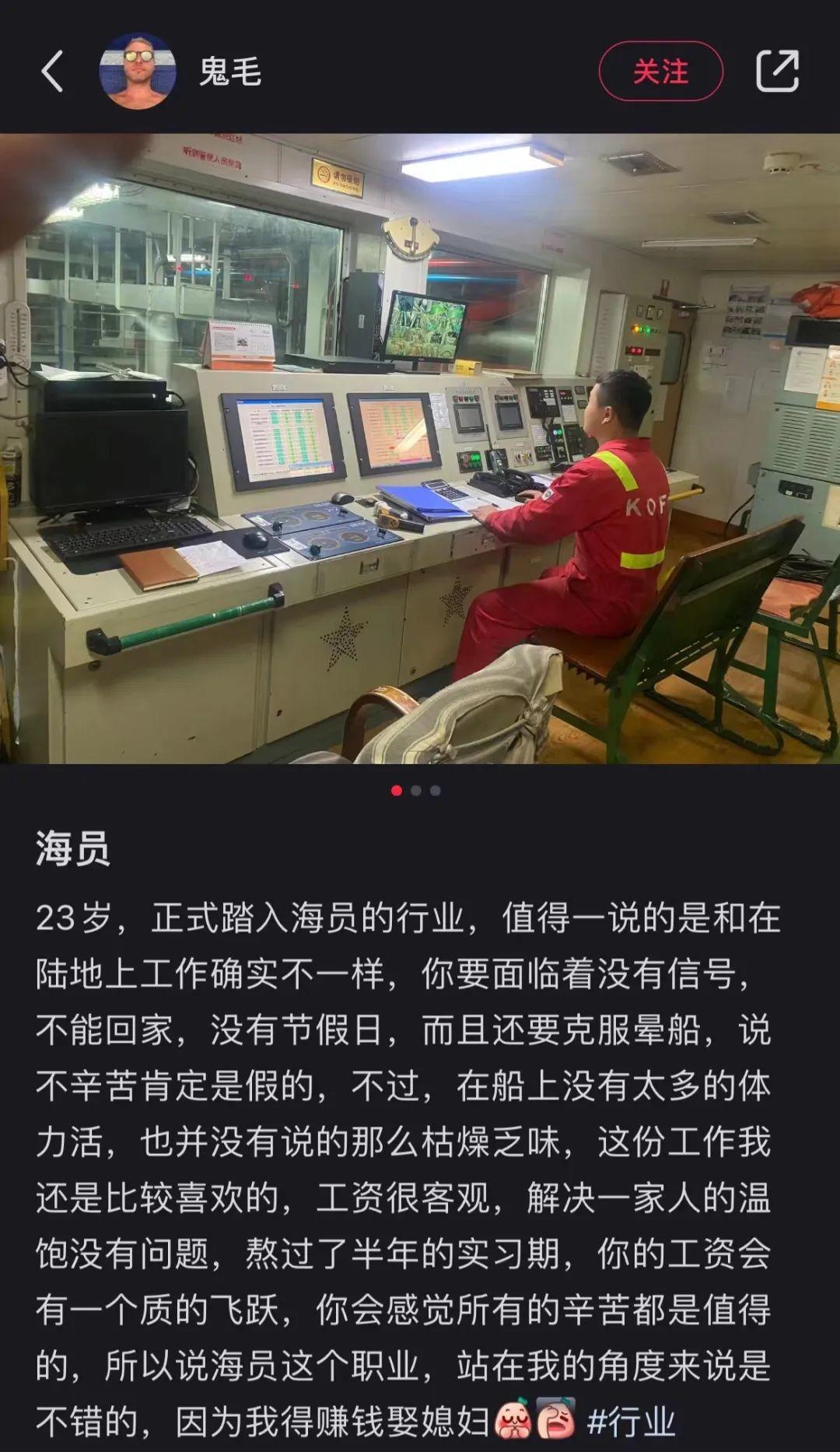 海員的工作是值班制,一天八小時,平時以巡邏檢查為主,遇到特殊情況忙一些,但總體來説工作量和地上的996沒法比。