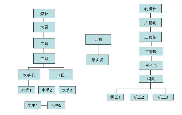 船長:是整艘船的指揮官,對全船負責。主要起連接公司,溝通岸上的作用。