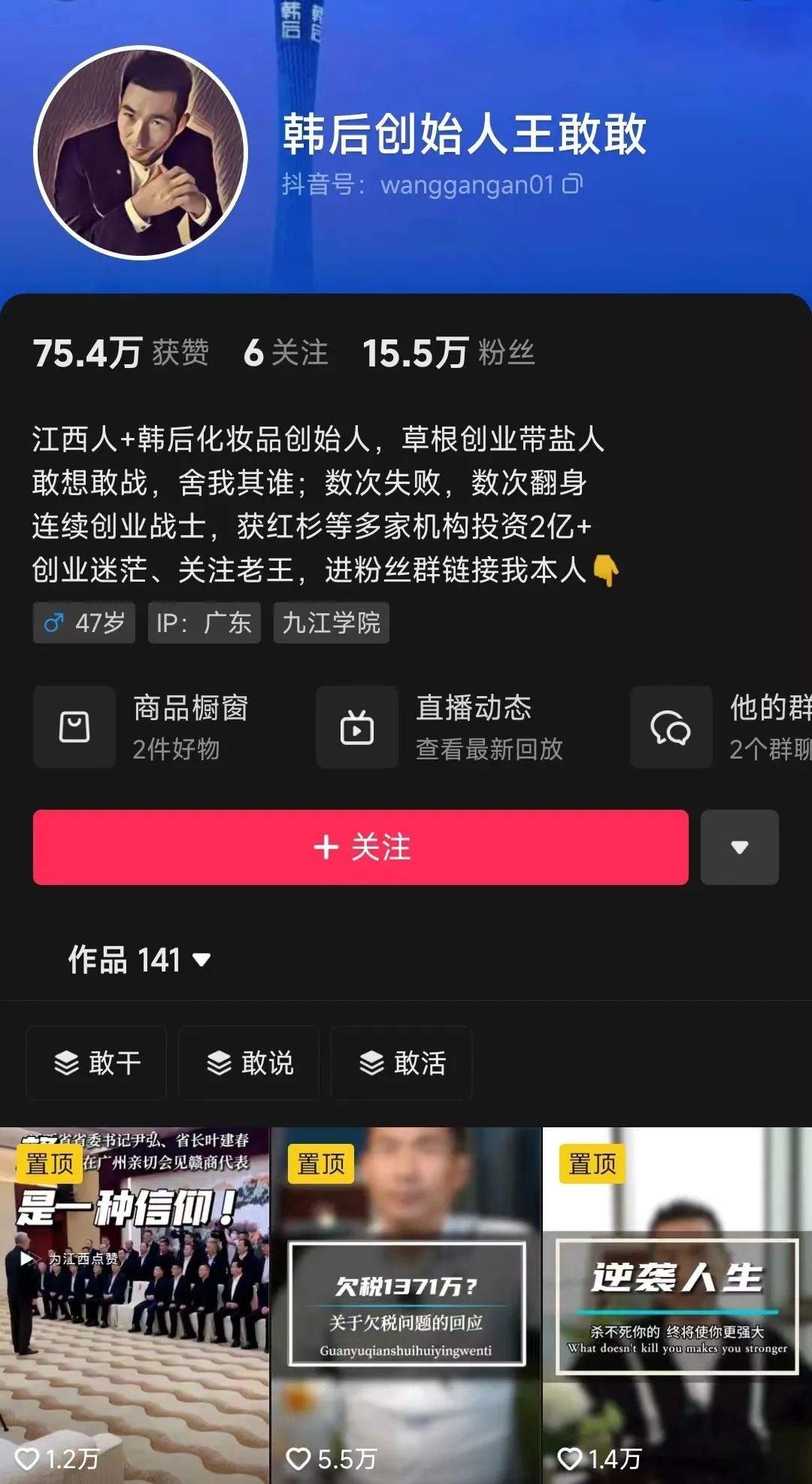 對於未來,王國安寄希望於直播和個人IP來獲得流量,從而帶動韓後“東山再起”。在抖音,王國安以“韓後創始人王敢敢”開通了賬號,通過視頻的形式“轉播”自己作為老闆的工作和生活日常,內容上突出一個“敢”字——敢幹、敢説、敢活,至今,王國安已發佈了上百條視頻,粉絲超過15萬。
