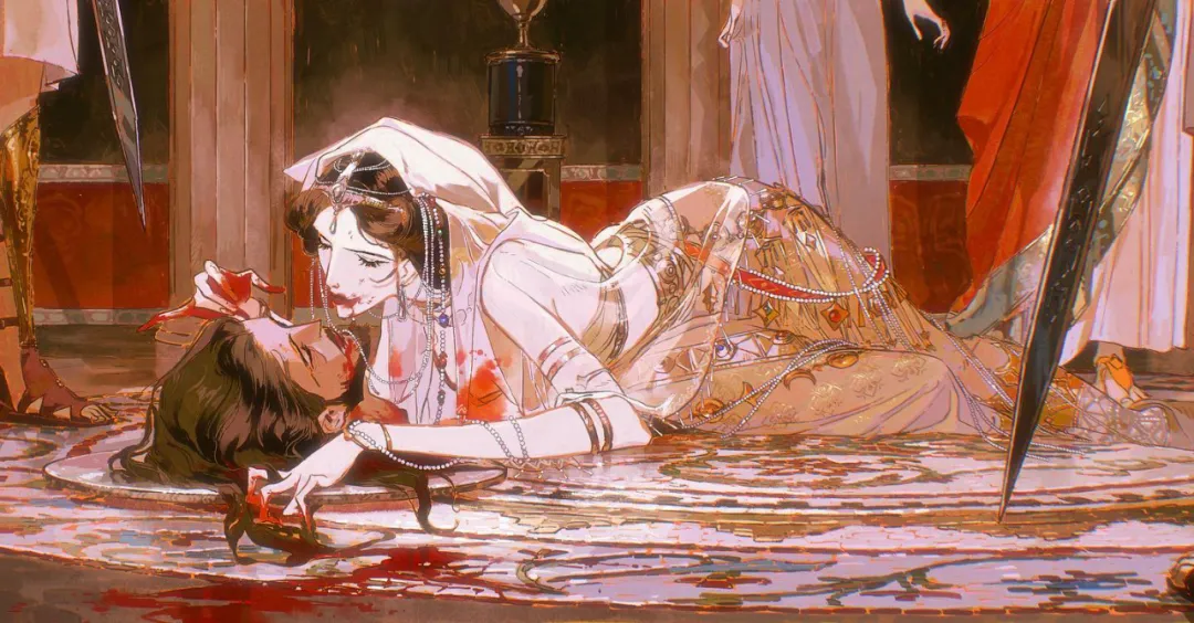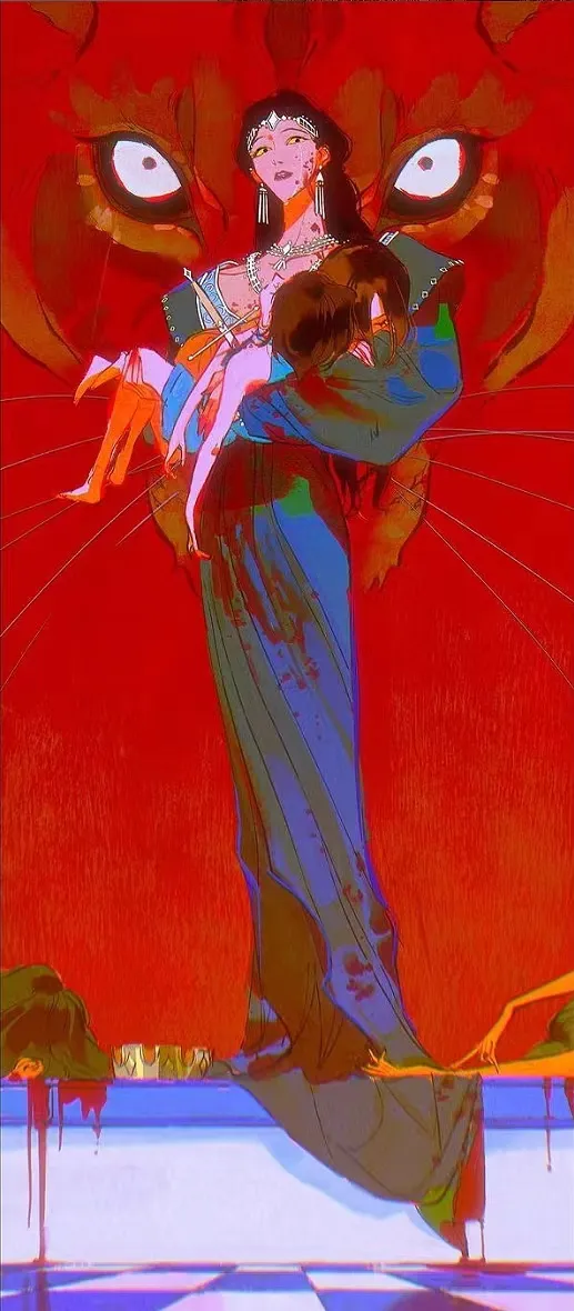 她裝束如同神母,抱着兩個孩子,眼角流淚,是為子復仇的女神?