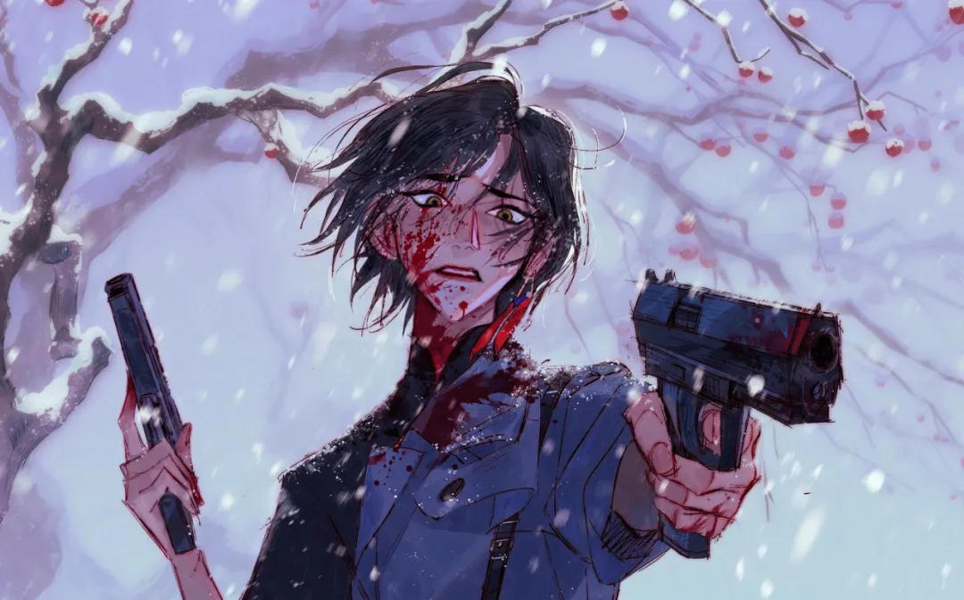 他兩手舉槍,卻面露痛苦,是否他親手殺了愛人?
