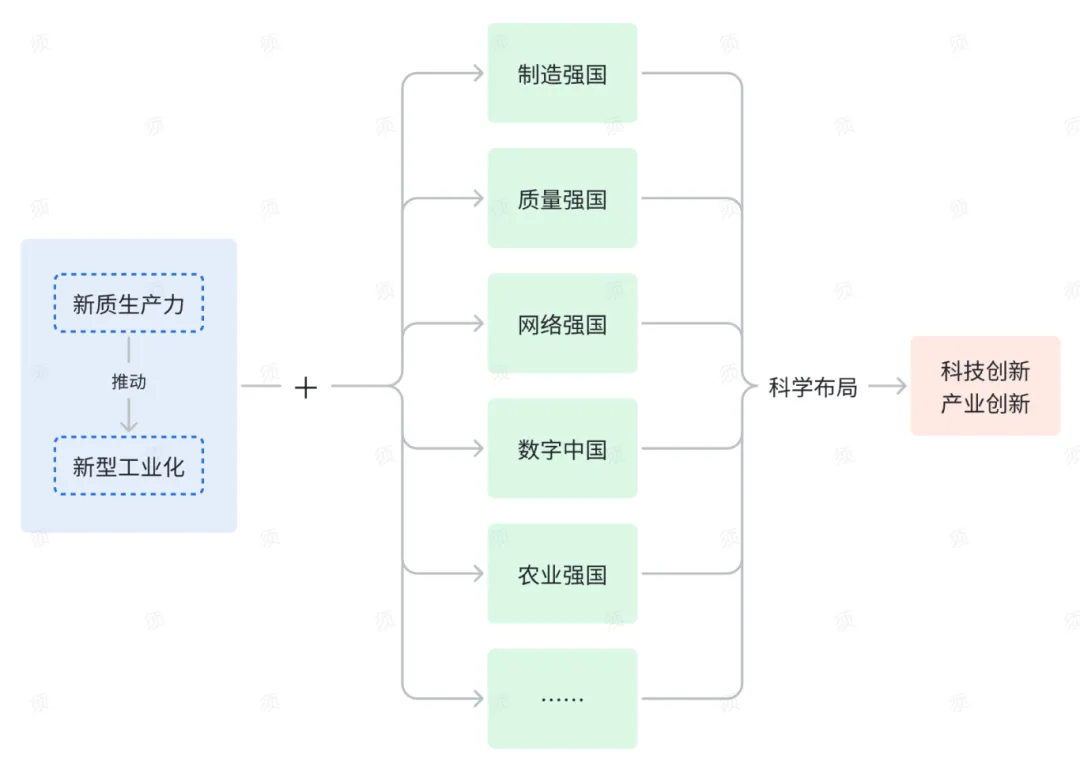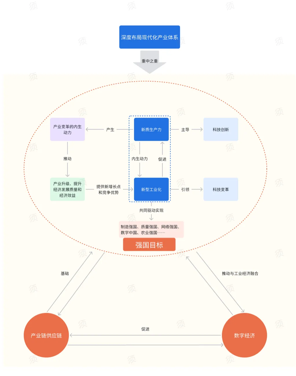 **面對“雙循環-新發展”格局,在新型工業化中加快產業數字化轉型無疑成為構建產業基礎能力、提升產業鏈現代化程度與韌性能力的必然選擇。**在全球經濟面臨百年未有之大變局的背景下,通過將技術實力與戰略遠見相結合,實施科學產業鏈佈局,是提升全球競爭力的關鍵舉措。這一戰略舉措的核心就在****於構建以“新質生產力+新型工業化+N個強國目標”、“產業鏈供應鏈”、“數字經濟”為主要內容的戰略三角,從而實現現代化產業體系的深度佈局。