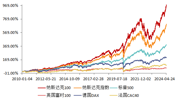 2010年以來,納斯達克100指數累計漲幅996.16%,顯著跑贏納斯達克綜合指數、標普500等美股主要指數,同時大幅跑贏英國富時100、德國DAX、法國CAC40等全球其他主要市場核心指數。