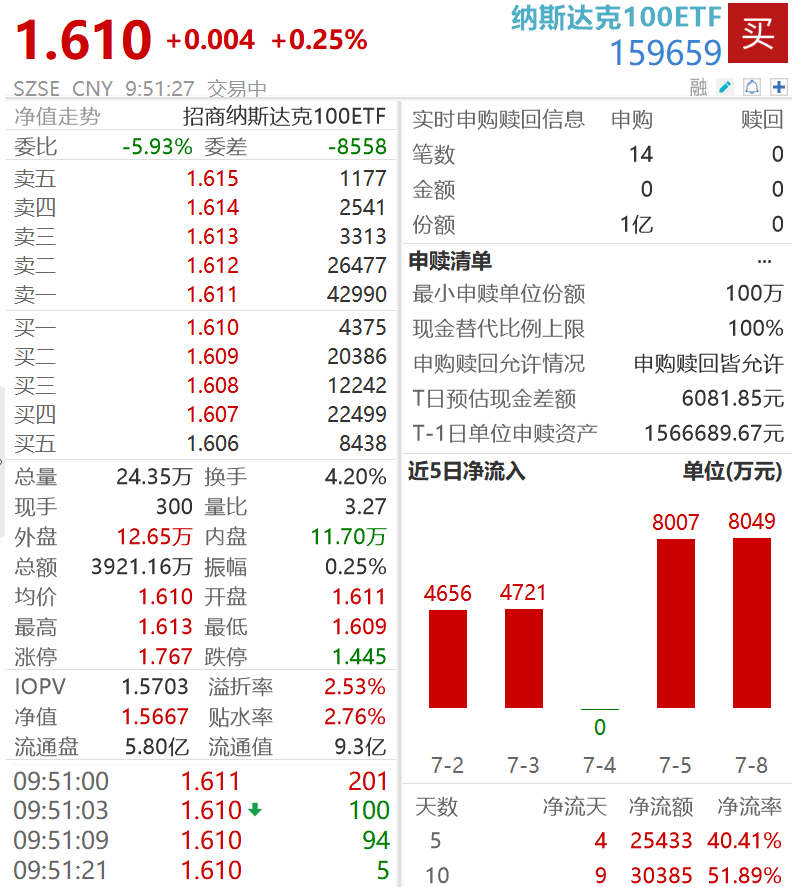 熱門ETF方面,截至今日9:51,跟蹤納斯達克100指數的**納斯達克100ETF(159659)**上漲0.25%,實時價格1.61元,早盤成交超3900萬元。截至昨日,**納斯達克100ETF(159659)**近10日獲資金淨流入超3億元。