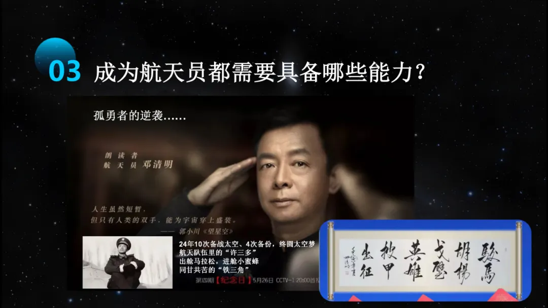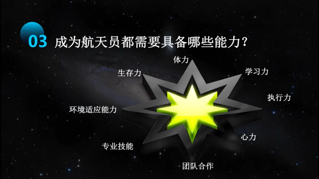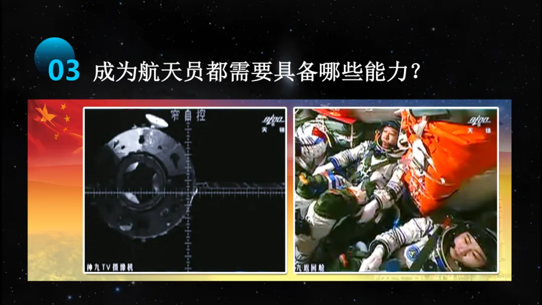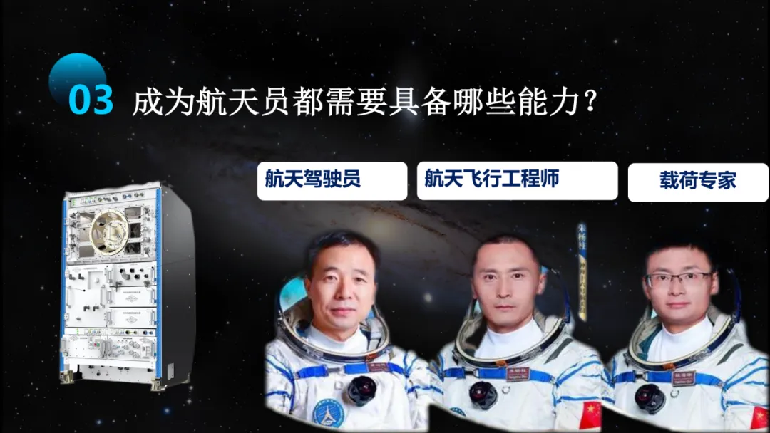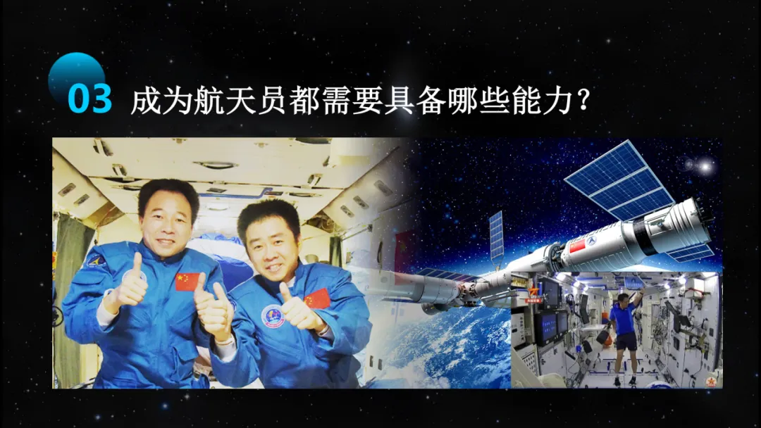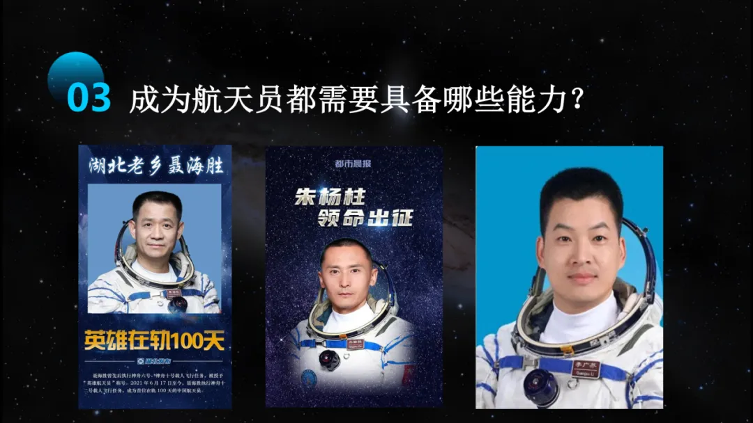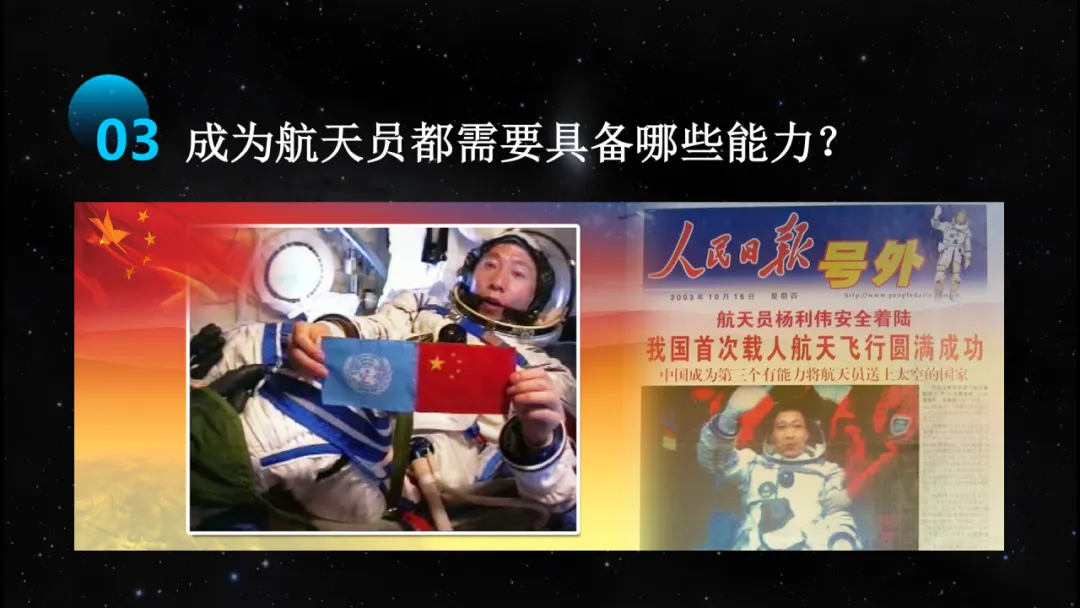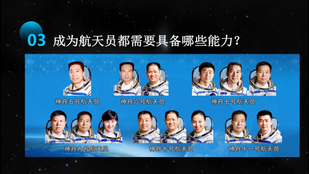 大家可能對我還不太熟悉,但一提起我的學生,你們可能都認識。航天員楊利偉、翟志剛、景海鵬、劉洋、王亞平、陳冬等,這些閃耀在航天領域的明星,他們都曾是我的學生。我有幸擔任了15年的航天員教員,主要負責工程領域的課程,參與了兩批航天員的選拔和7次載人航天飛行任務,其中也有多批次的航天員訓練任務,每一次都充滿挑戰與激情。目前,全球已經有500多位航天員進入過太空了,中國僅有22位,可以説是億裏挑一。航天員的稀缺性也讓大家對他們產生了無限的遐想和好奇。