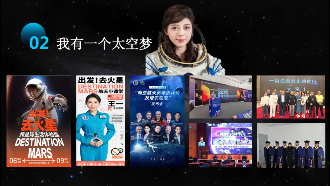 許多人曾經問我這樣一個問題:“王一,你上過太空嗎?”很多年前,我也曾經有過一個太空夢。夢想就像珍珠,需要不斷地去刺激它。多年前,我曾以模擬航天員身份參與航天員的選拔試驗。但航天員選拔標準嚴格,有200多條選拔標準,我仍有未達標之處。隨着中國航天的輝煌發展,我的太空夢最近又再次被點燃。2022年,我投身於商業航天員的選拔和訓練標準得制定。令人振奮的是,我們計劃於2028年前發射首艘可返回式載人商業船,預計送100位太空遊客進入太空。